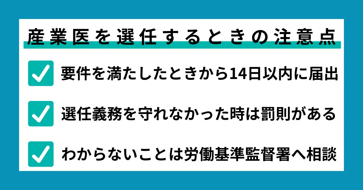 まずはできるだけ早く産業医を選任してください。