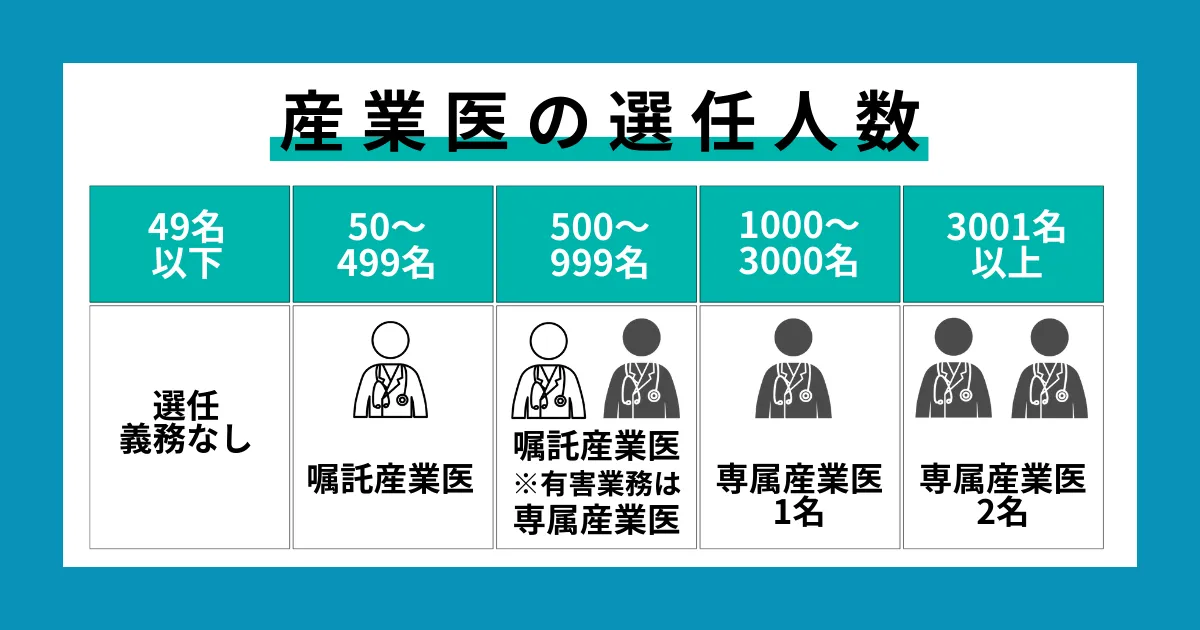 | 50〜999名 | 産業医1名以上(嘱託でも可) | 産業医1名以上(嘱託でも可) ※500名以上は専属 |